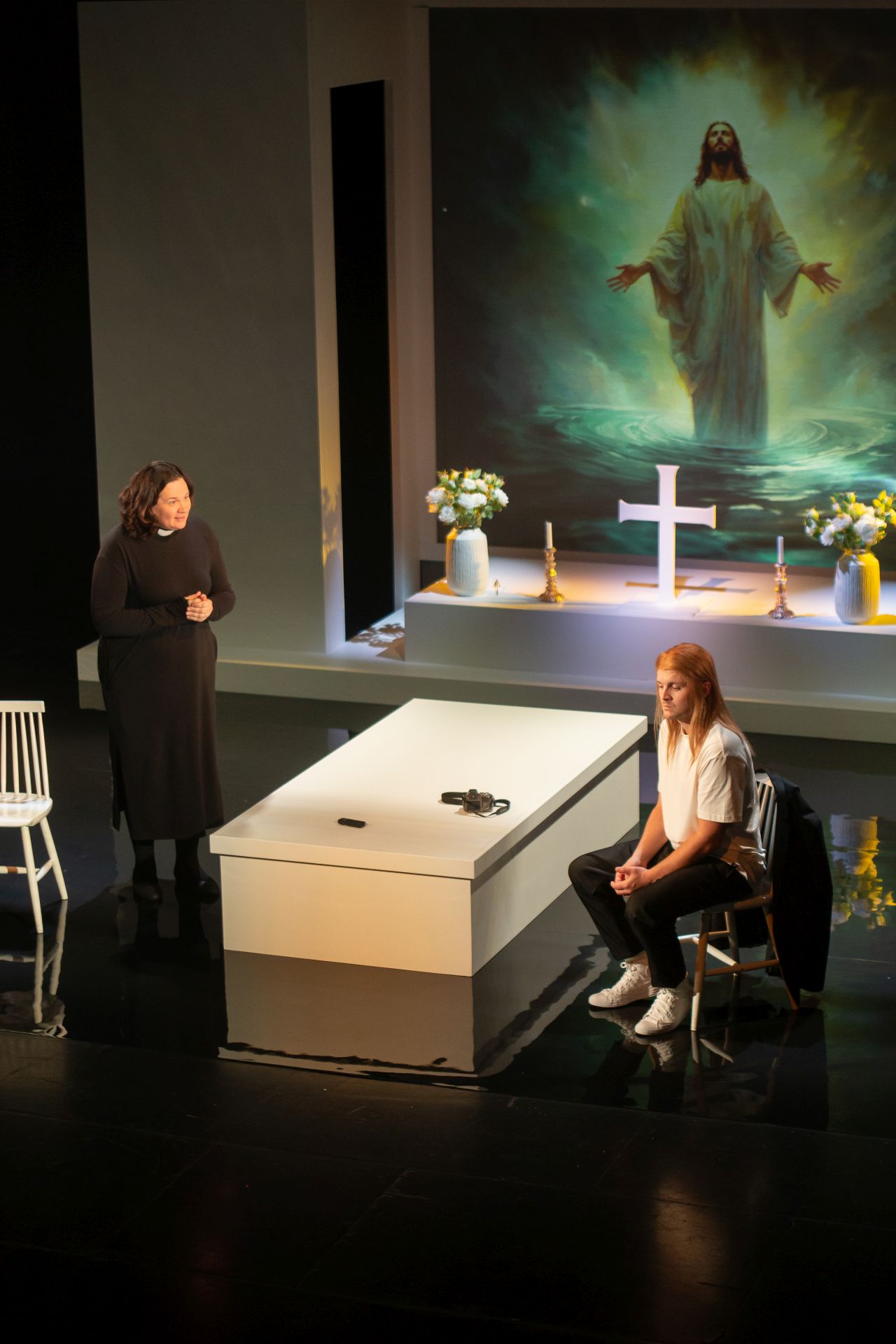 Näidendi tegevus leiab aset päeval, mil toimuvad Soome Evangeelse Luterliku Kiriku piiskopi valimised ja autori tahtel on üheks kandidaadiks naisvaimulik. Pärast kirikus toimunud matuse-talitust kohtub ta noore ajakirjanikuga, kes on tulnud temast persooniloo kirjutamiseks intervjuud võtma. Vestlus venib pooleteisttunniseks jutuajamiseks, mille käigus kooruvad samm-sammult lahti mitte ainult tegelaste erinevad vaated religioonile vaid ka nende minevikupained, mis on autorile andnud alust määratleda oma näidendit kui „psühholoogilist“ thrillerit süüst ja vastutusest. Kuna „thriller” tähendab aga lugu, mis on täis pinget, ärevust ja hirmu, siis põnevuse hoidmiseks ei saa tema sisu rohkem avada.