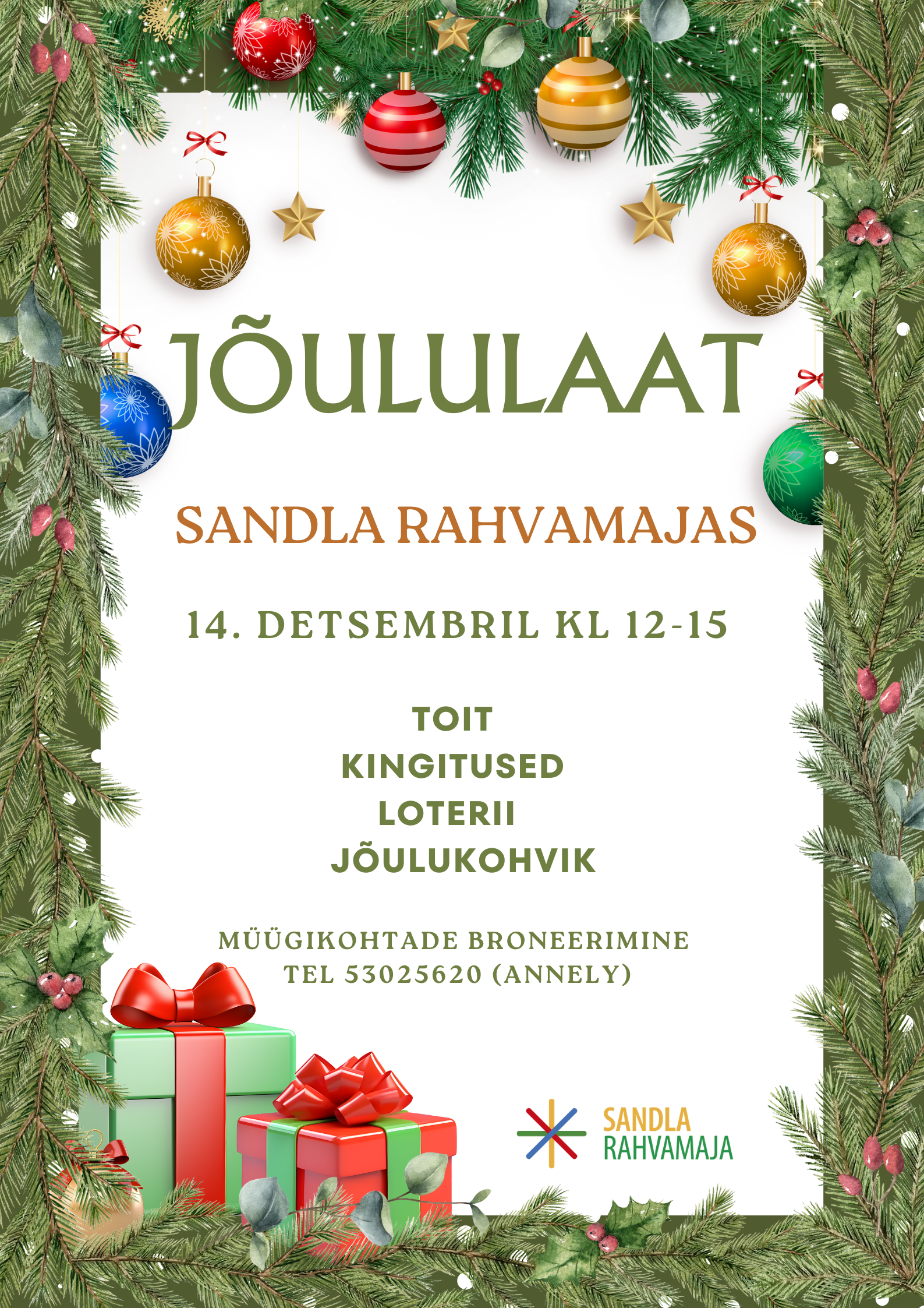 Toimub traditsiooniline jõululaat, avatud jõulukohvik, loterii. Müügikohtade broneerimine tel. 53025620 (Annely)