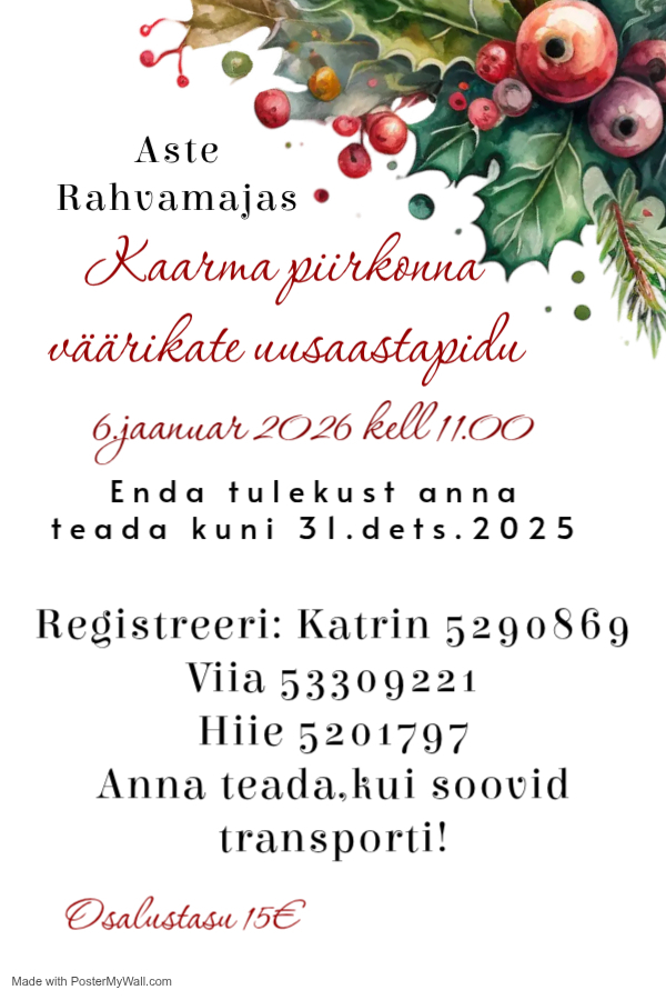 6.jaanuar kell 11.00 Kaarma piirkonna eakate uusaasta pidu.