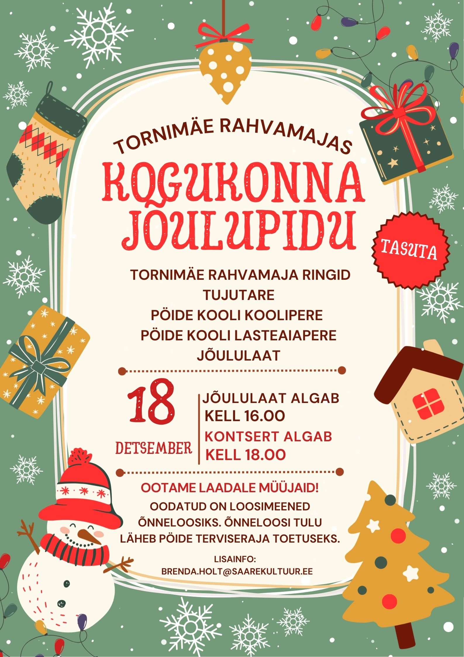 𝟏𝟖.𝟏𝟐 𝐤𝐞𝐥𝐥 𝟏𝟖.𝟎𝟎 𝐨𝐧 toimumas Tornimäe rahvamajas kogukonna jõulupidu.